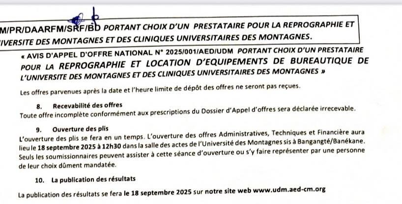 LโUniversitรฉ des Montagnes de Bangangtรฉ (UdM) lance un Appel dโOffre National Ouvert pour le choix dโun prestataire pour la location des รฉquipements de reprographie.
